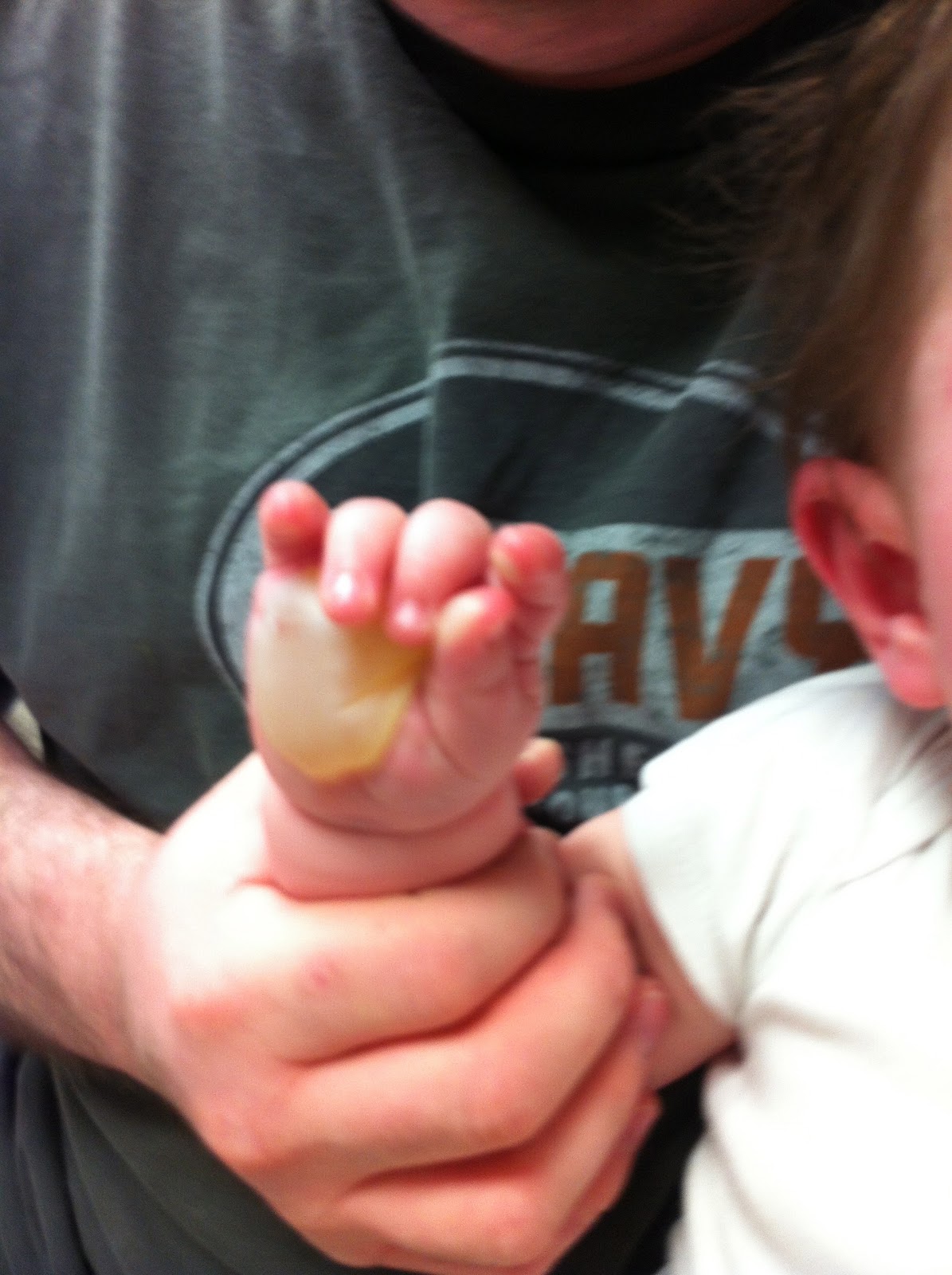 I swept him up and ran him to the sink to run it under cold water. He was sobbing uncontrollably! It was horrible! I knew that he was burnt but had no idea to what extent. I was home alone with 5 kids under 6. I tried calling numerous cell phones but of course no one was picking up because they were all in church. I could not calm him down and knew I needed to get some help...at least to watch the kids so I could take him to the ER. I loaded him up in the jeep and told Maggie she needed to watch the kids. I drove as fast as I could to the church looking for any familiar passing cars on the way. I ran in the church and found my dad. He came out and said he would take me back to Rick and Amys and we could put some Aloe on it to stop the burn. Once we got back and I was able to look at his hand again I realized I needed to take him straight to the ER...